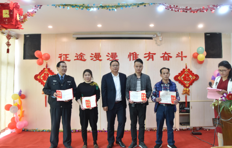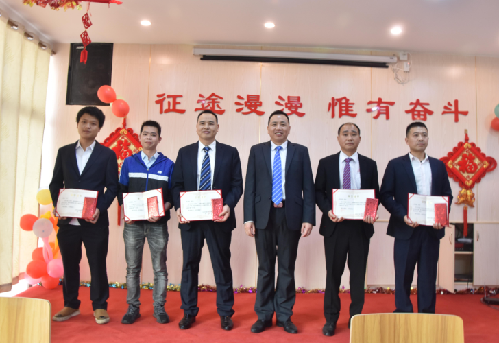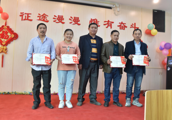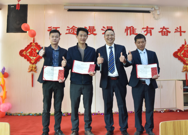營(yíng)銷部經(jīng)理伍綱強(qiáng)為邱高明、周美芳、黃榮先、龔超頒發(fā)先進(jìn)個(gè)人獎(jiǎng)