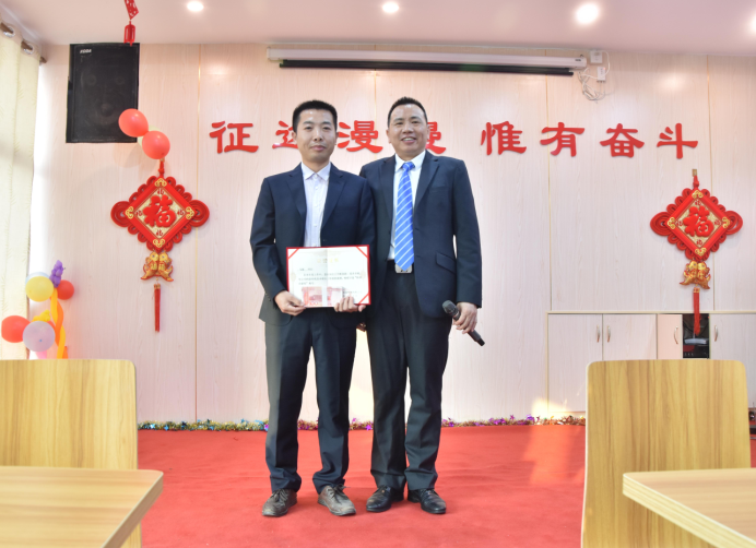 市場(chǎng)營(yíng)銷部經(jīng)理羅曉明為付新民、黃文頒發(fā)優(yōu)秀管理獎(jiǎng)