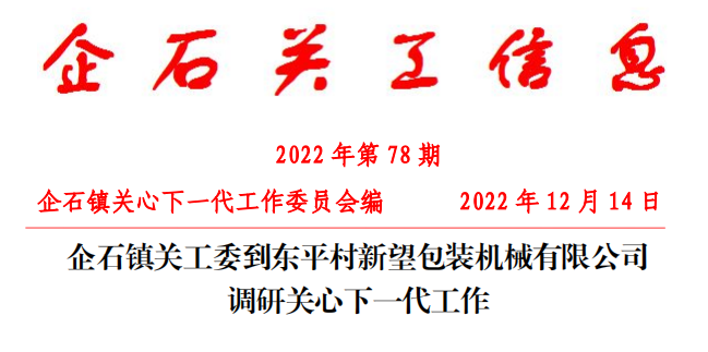 12 月 14 日上午,企石鎮(zhèn)關(guān)工委到東平村新望包裝機(jī)械有限公司調(diào)研關(guān)心下一代工作。企石鎮(zhèn)關(guān)工委主任楊煥柱,關(guān)工委副主任黃林燦、劉毅然,東平村關(guān)工委主任李堯木,公司董事長(zhǎng)羅永輝等參加了調(diào)研活動(dòng)。